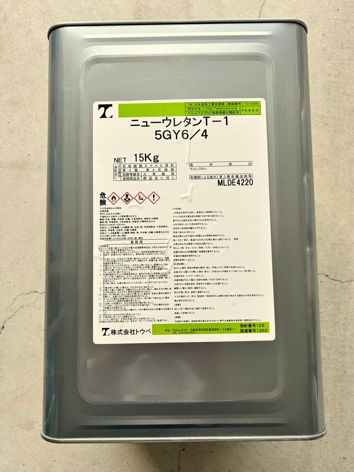 1液型のウレタン塗料です。 色はマンセル値で5GY6/4で、淡い緑色です。 メーカー:株式会社トウペ サイズ:15kg 1斗缶 正式名:トウペ ニューウレタンT-1